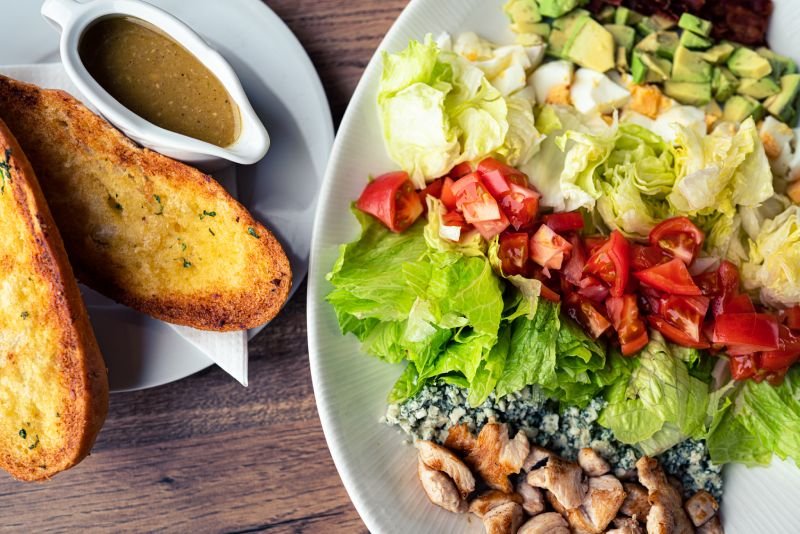 - One of the most popular salads. Iceberg lettuce, tomatoes, avocado, chicken, egg, blue cheese, grilled bacon, romaine lettuce, spicy Derby dressing, garlic bread.